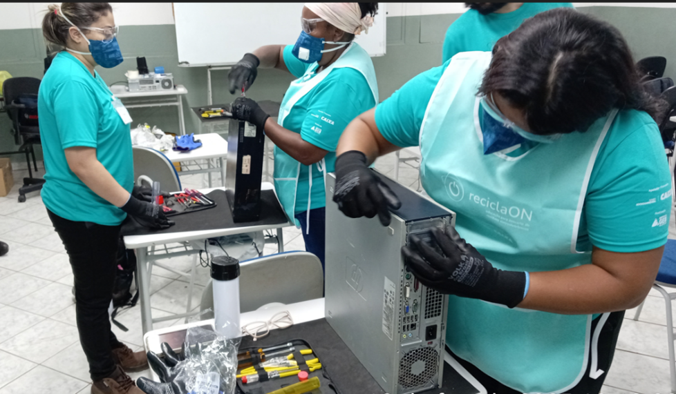 Os catadores também receberam orientação sobre segurança no manuseio dos resíduos e boas práticas ambientais, uma vez que os REEE contêm metais pesados.