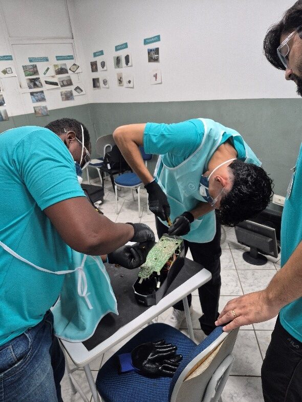 As aulas abordam temas como desmontagem prática de equipamentos eletrônicos (foto), uso correto de EPIs (Equipamentos de Proteção Individual), os perigos da contaminação, armazenamento seguro e descarte adequado de cada resíduo, entre outros.
